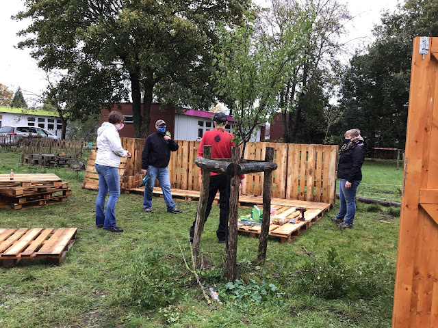 De buitenkeuken in opbouw. Onder de mondmaskers zitten juf Kelly, juf Ilse en meester Ken verborgen. De overige juffen zijn aan de slag in de klas en zullen deze namiddag aansluiten.