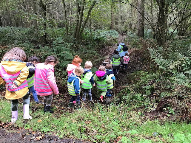 Eén voor één volgen de kleuters. Dit geeft een andere dimmensie aan het bos.
