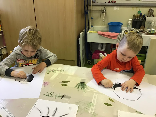 De schooldag begint met een schets van Piet. Hiervoor gebruiken we houtskool.
